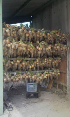 畑に行くとすでにたまねぎは収穫済みで土の上に置いてありました。今回はこれをキャリーに入れて倉庫に運んで倉庫の横の風通しのいいところに吊るってのが仕事です。取れたてのたまねぎは水分が多くすぐに腐るため、吊っておいて乾かしたほうがいいらしい・・・。