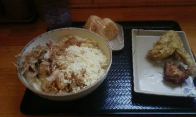 今日頼んだのは温玉ぶっかけ(冷・大)、おにぎり、げそ天、からあげと奮発しました♪